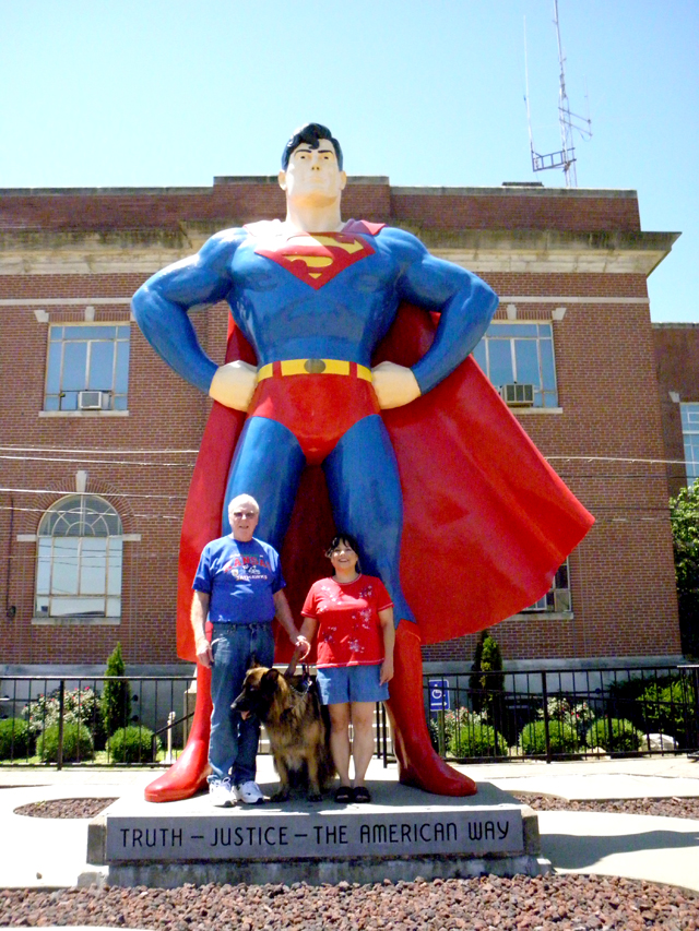 Bob and Lillian Lockwood with Buddy at the Superman statue in Metropolis, Illinois at the Court House